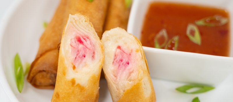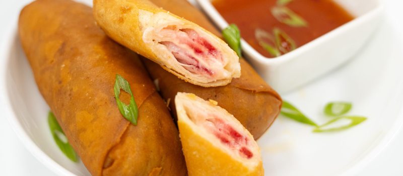 Three mini-size egg rolls—your choice of pork, chicken, or veggie—paired with one sweet dessert egg roll in strawberry or cherry. A delicious mix of savory and sweet, perfect for snacking or sharing.