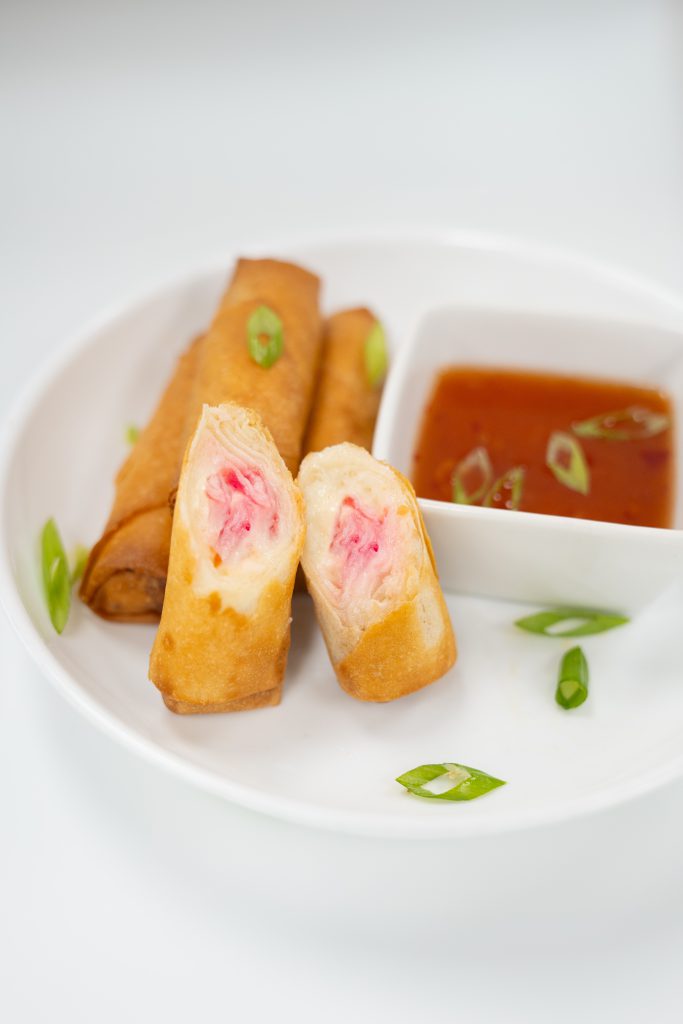 Three mini-size egg rolls—your choice of pork, chicken, or veggie—paired with one sweet dessert egg roll in strawberry or cherry. A delicious mix of savory and sweet, perfect for snacking or sharing.
