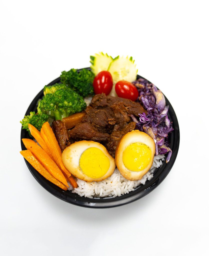 A flavorful bowl of tender pork served over rice & surrounded by a mix of colorful vegetables —choose between: Sweet Chili Pork or Braised Pork